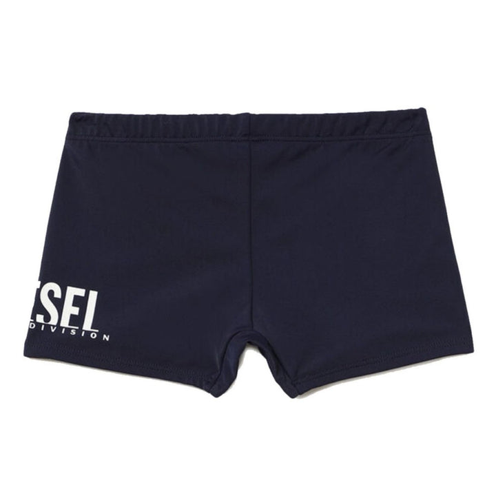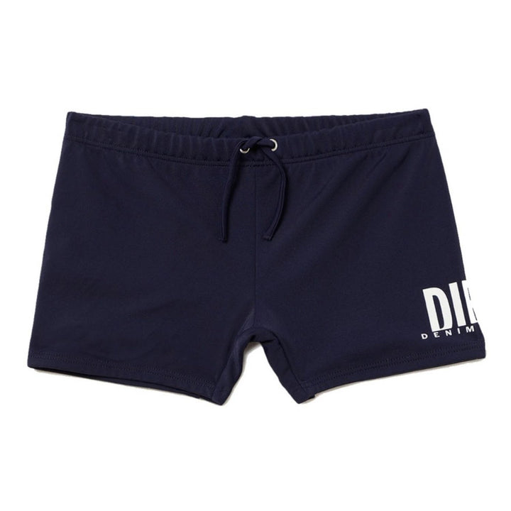 Swim trunks crafted from nylon spandex and featuring elastic waistband with drawstring and eyelets. Complete with denim divisione print on the back.