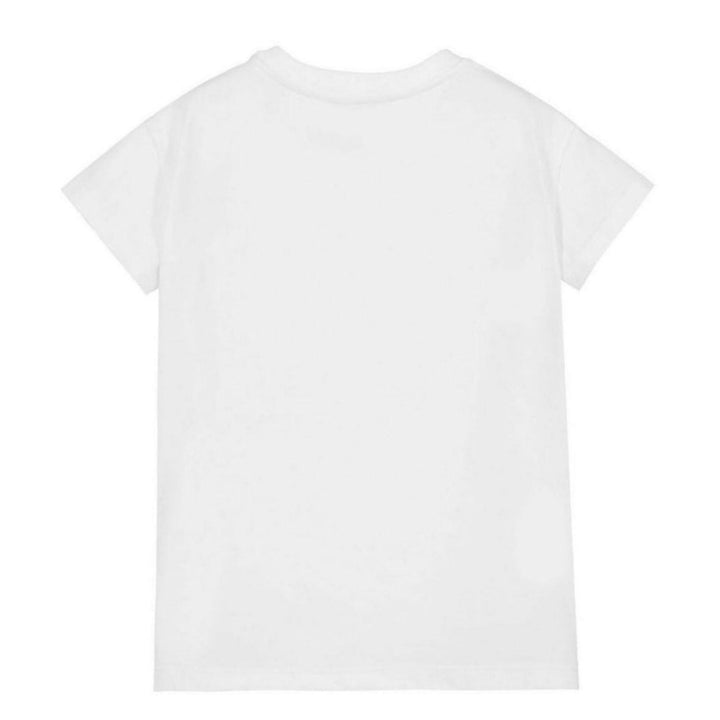 Teen girls white cotton jersey dress by luxury brand Ellie Saab. The black logo is embroidered and embellished with matt sequins.