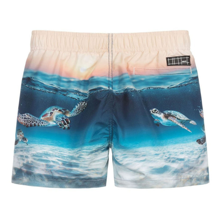 Teen boys sun protective swim shorts by Molo, with a beige and blue sea turtle print, and UPF 5+. They are made in lightweight recycled polyester, with a mesh lining and an elasticated drawstring waist.