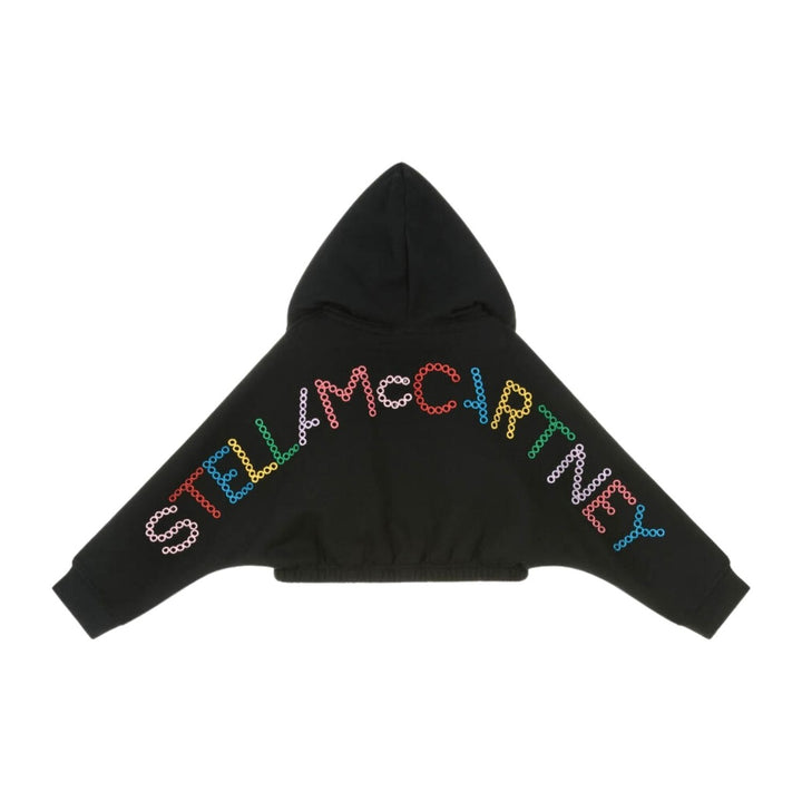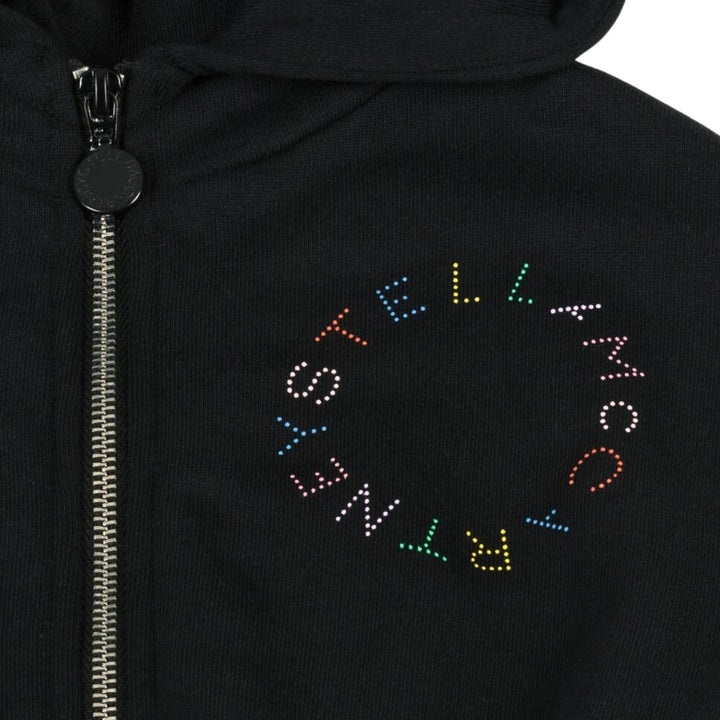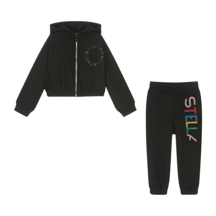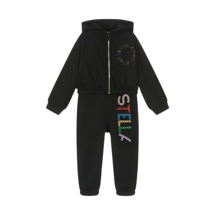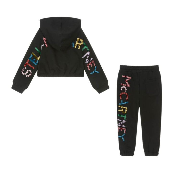 Eye-catching black organic cotton tracksuit for girls by British brand Stella McCartney Kids, made in comfortable jersey with a cosy, fleecy inside. Unmistakably by the designer, it is boldly embellished with embroidered logos across the back of the hoodie and on one leg. The hoodie has spacious, batwing sleeves and a printed, circular logo on the chest. The joggers have a comfortable, elasticated waistband and useful, concealed pockets on the side seams. The Stella McCartney fit can be quite small so choose a size up if you want room to grow.