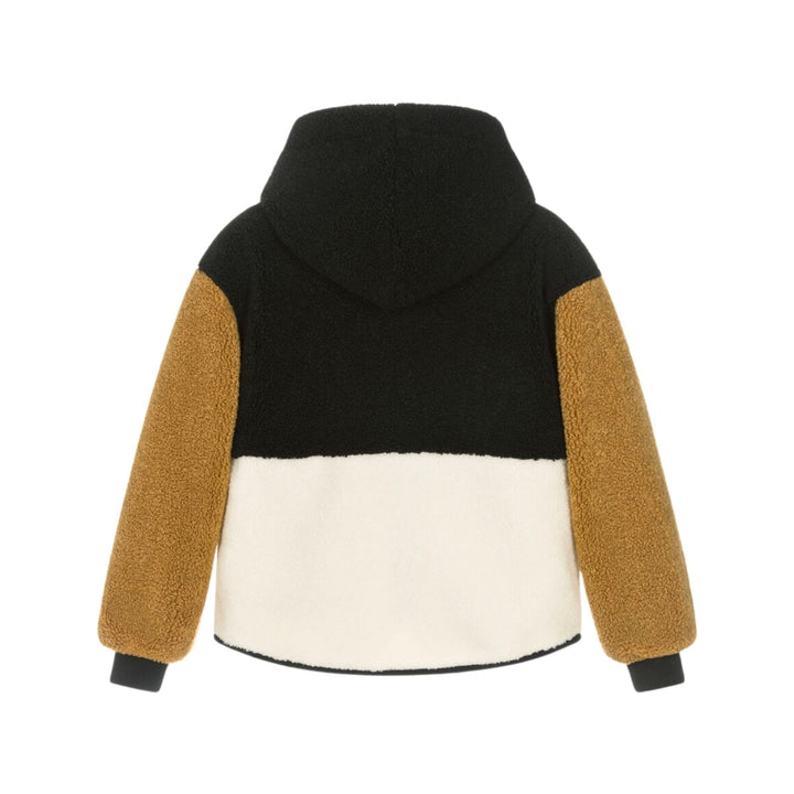 Cosy hooded fleece jacket for boys and girls by luxury Italian designer Moschino Kid-Teen, colour blocked in black, tan brown and ivory. For instant brand appeal, it has a rubberised Moschino Teddy Bear logo and a branded pull tab on the silky, zip-u