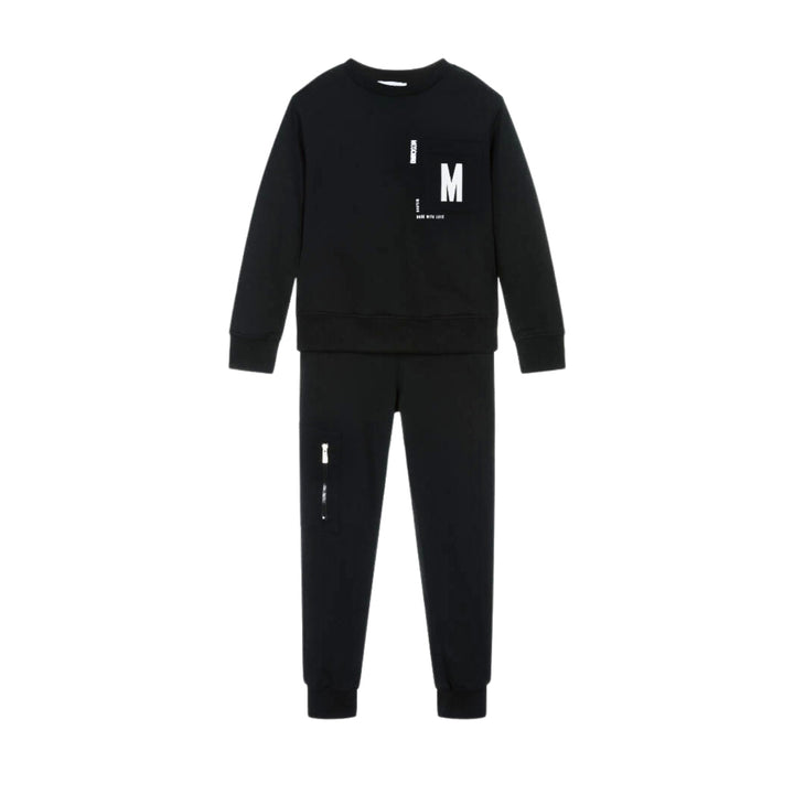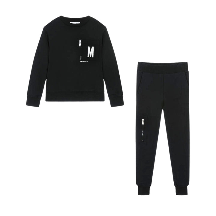 A cool black tracksuit for boys and girls by Moschino Kid-Teen, inspired by the adult collection. Made in comfortable cotton jersey, the sweatshirt has a white 'M' logo printed on the chest pocket with a slogan that reads 'Milano Made With Love'. The