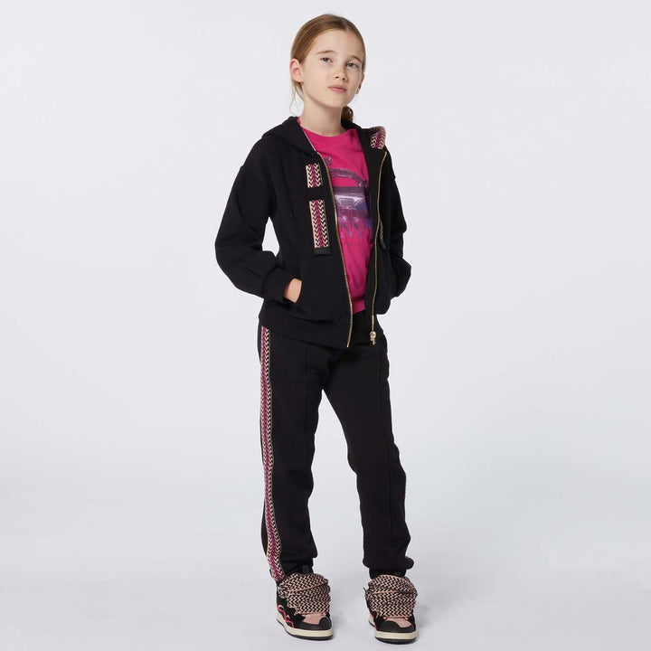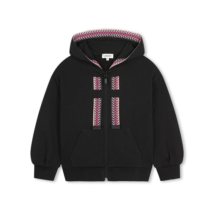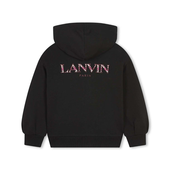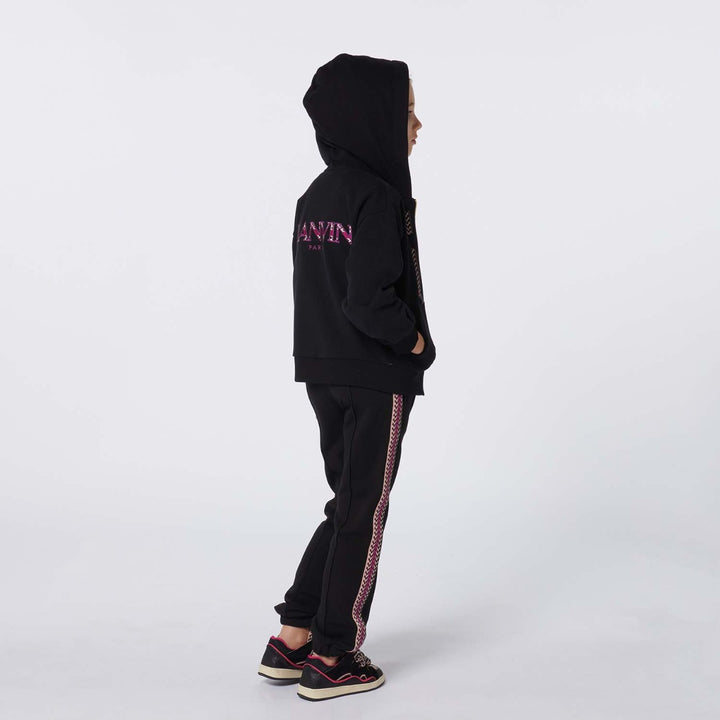 A cool zip-up hoodie for boys and girls by French brand Lanvin, in a black colourway with bold logo embroidery on the back. Made in cotton jersey, this mid-weight layering piece features black and black herringbone 'Curb' trims for a signature look.