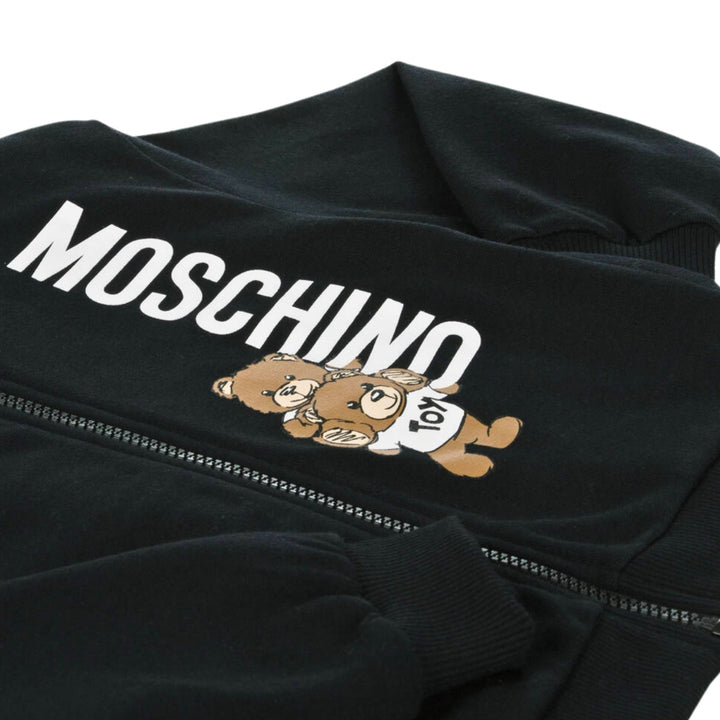 A black zip-up hoodie for boys and girls by Moschino Kid-Teen. Made from soft mid-weight cotton jersey, it has a cosy fleecy interior, useful side seam pockets, and casual ribbed trims. Printed on the front is a bold Moschino Teddy Bear logo design for a signature look.