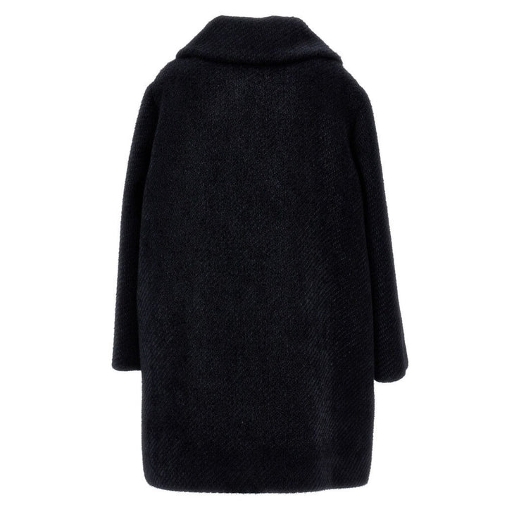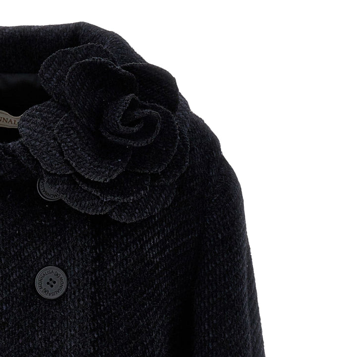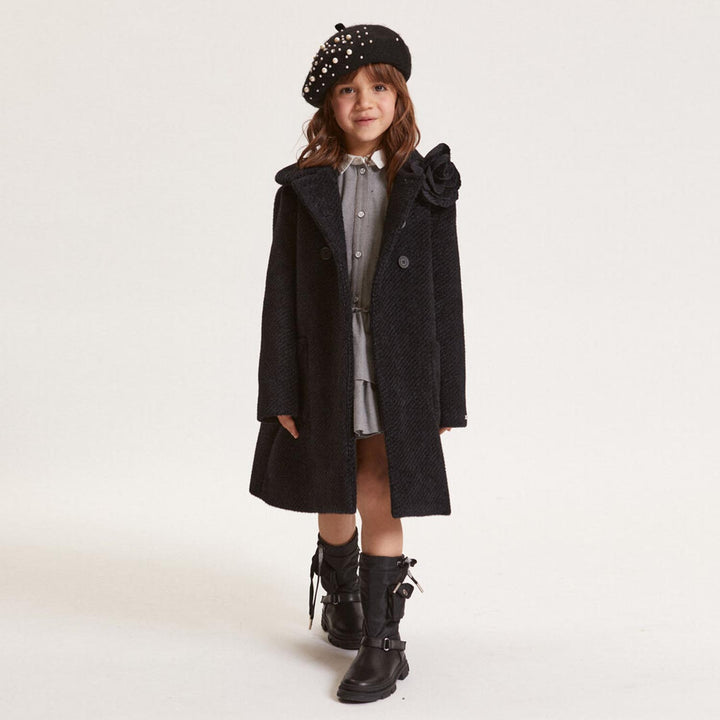 Unisex Black Floral-Print Woolen Coat by Monnalisa – stylish, warm, and versatile for all-season layering.