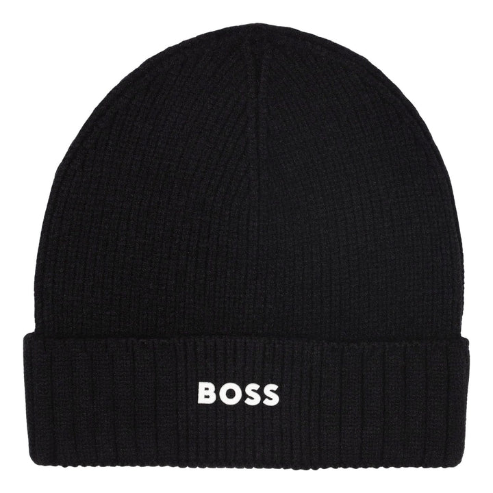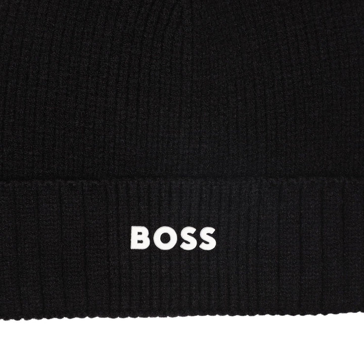 This classic black knit beanie from BOSS features a ribbed folded cuff and a crisp white BOSS logo at the front. Made from soft, comfortable fabric, it provides warmth and a snug fit, making it ideal for chilly weather. The minimalist design ensures versatile styling, perfect for everyday casual wear or pairing with any winter outfit.