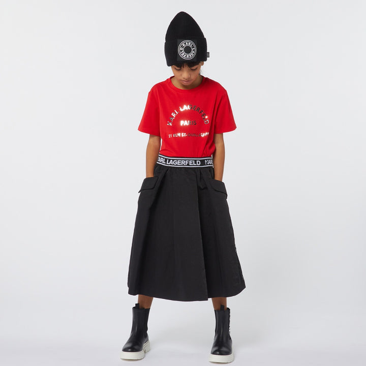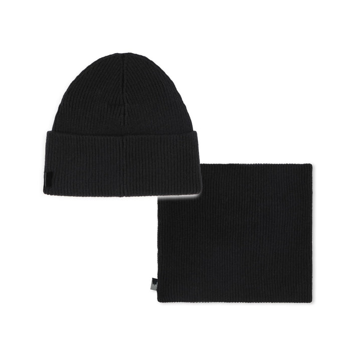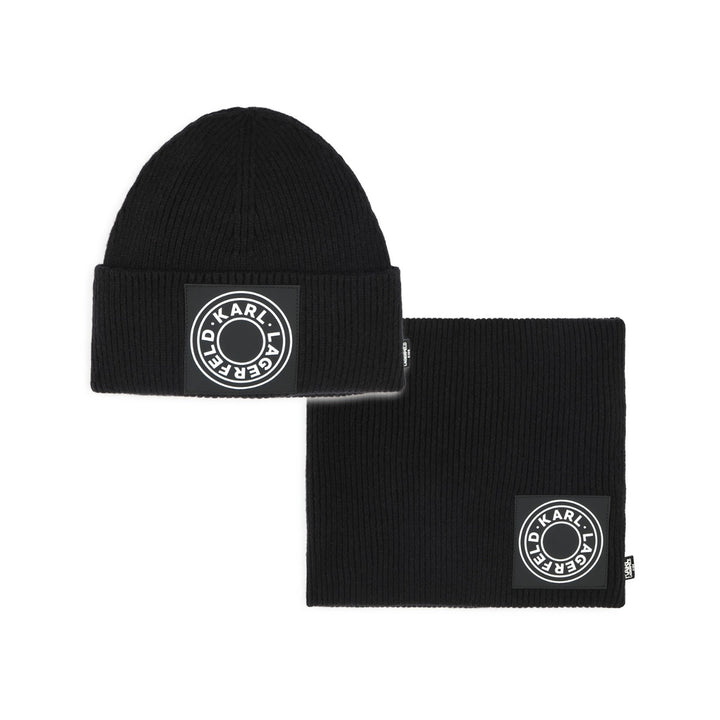 A black, Mini-me logo-inspired hat and snood set for boys and girls from KARL LAGERFELD KIDS. In a monochromatic style, the coordinating pieces are made in a chunky ribbed knit with a white circular logo embossed patch for a statement look. The stylish beanie hat has a wide turn-up brim and the snood is made in a double layer for extra warmth.