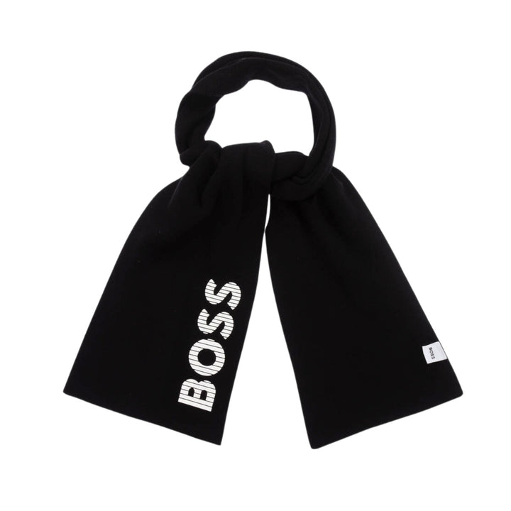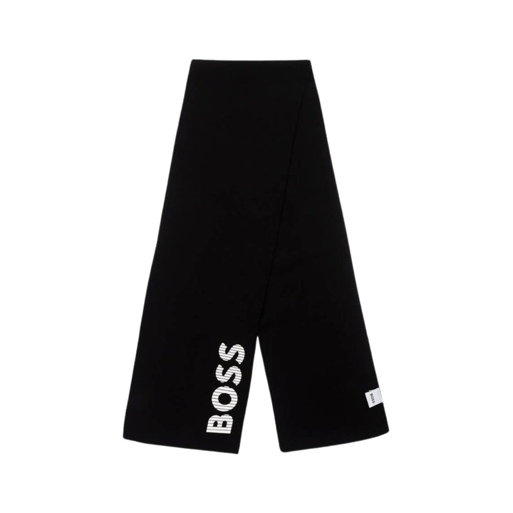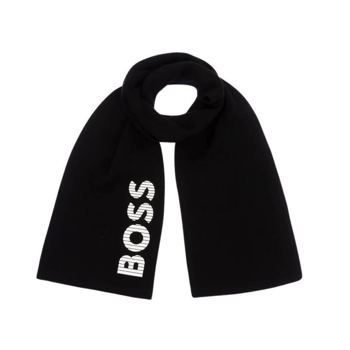 Mini-me black scarf for boys and girls by BOSS, knitted in super soft cotton. Ideal for those cooler days, this warm scarf has a bold, white rubberised logo on one side for an instantly recognisable look.