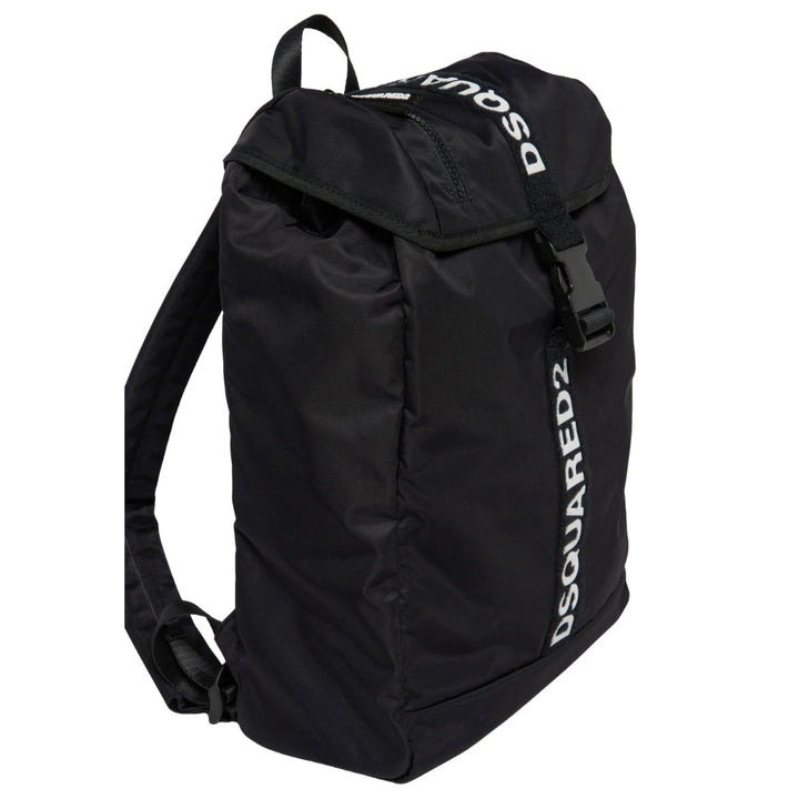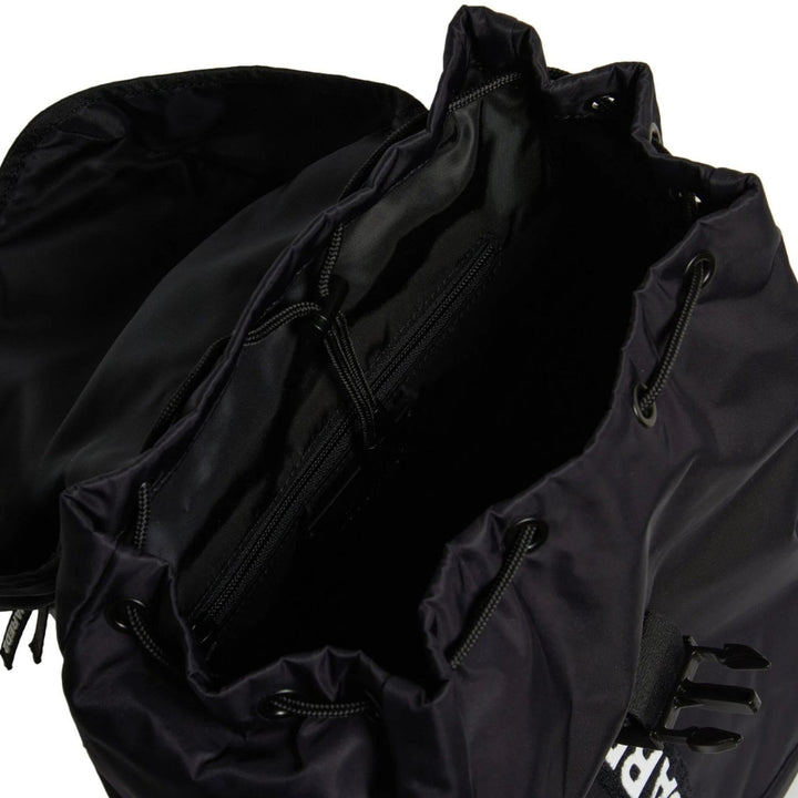 A sleek black backpack crafted from durable premium material, highlighted with a signature logo print. Combining modern style with practical design, it is perfect for everyday essentials.\