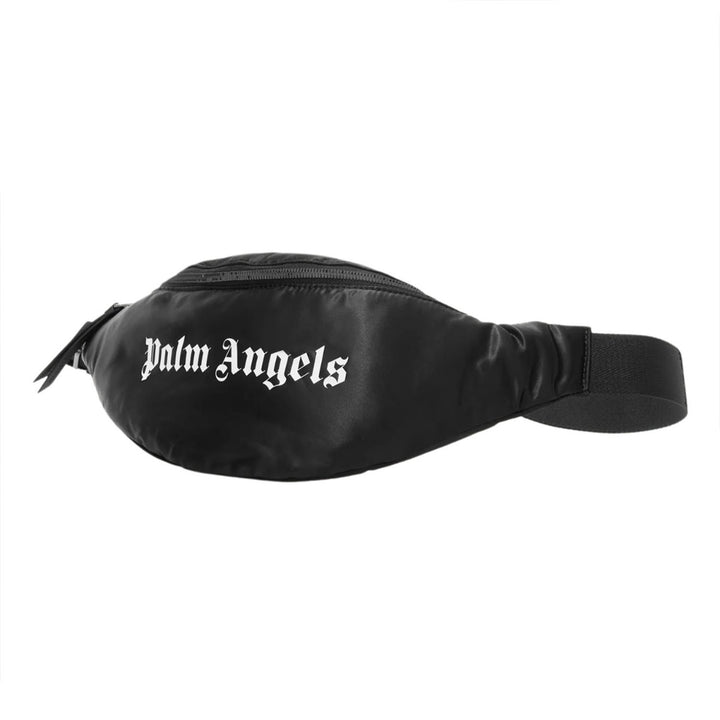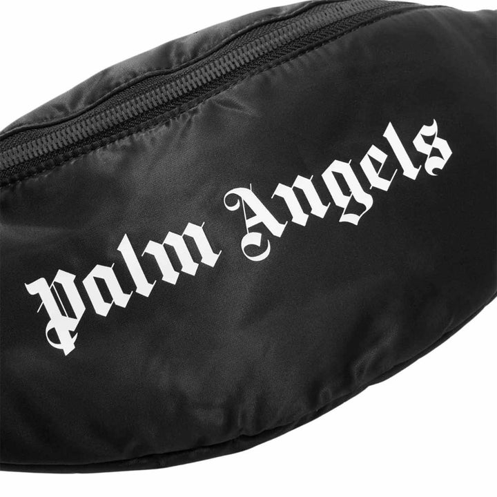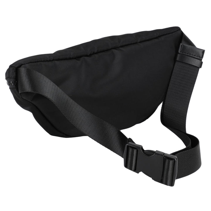 black and white logo belt bag with a front logo print, top zip fastening, adjustable waist strap, and a main compartment for easy access and style.