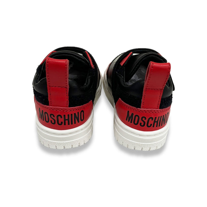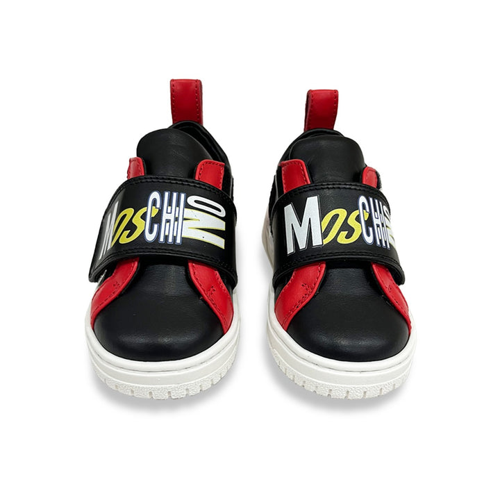 Black leather trainers for boys and girls by Italian brand Moschino, both stylish and practical for active days. The velcro strap across the front is enhanced by the Moschino logo-print. They have a comfortable leather lining, a heel loop on the back