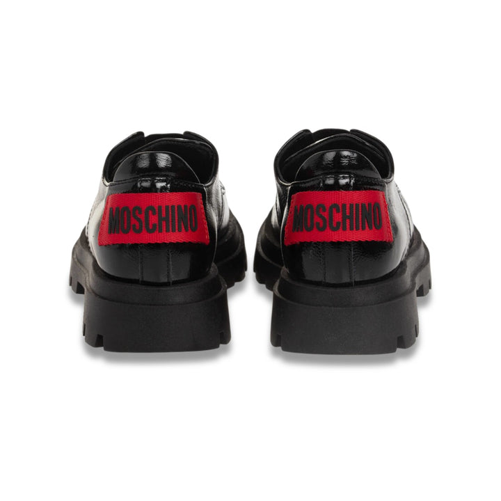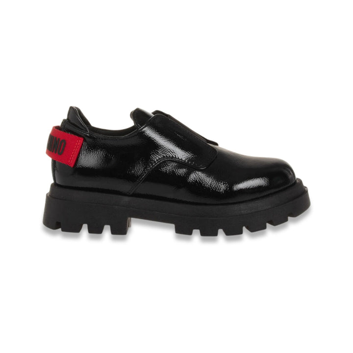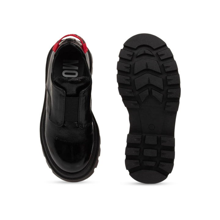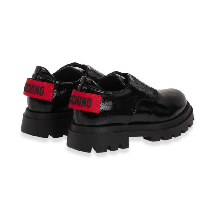 Black patent loafers for boys and girls by Italian fashion house Moschino, made and lined in luxurious leather. Contrast red logo details on the heels add a cool splash of colour to these sleek shoes. They slip on easily thanks to elasticated panels on the front. These non-slip shoes have chunky, rubberised soles for an edgy look.