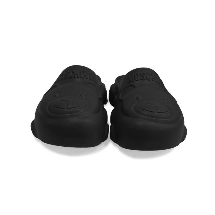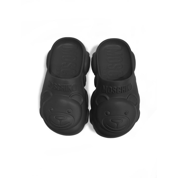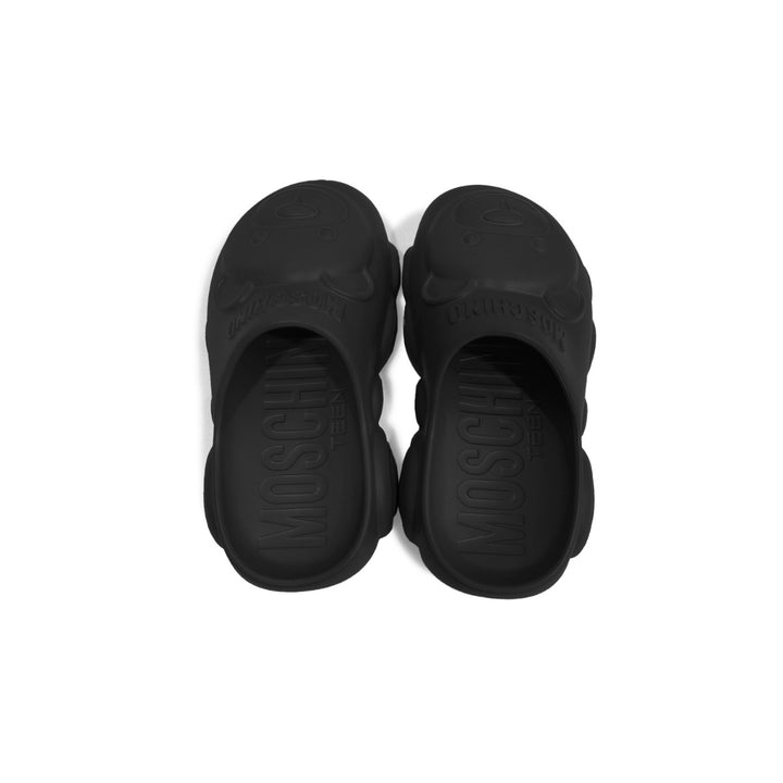 Black chunky clogs for boys and girls by Moschino Kid-Teen, made in lightweight foam rubber. Versatile to wear indoors and outdoors, these fun and comfortable slip-on sandals are moulded in the Moschino Teddy Bear shape with embossed logos for an unmistakable designer appeal.