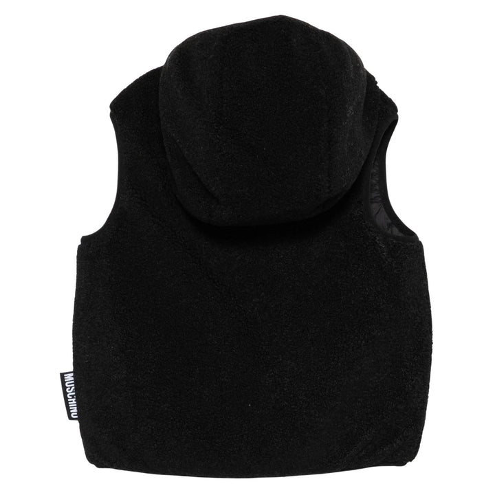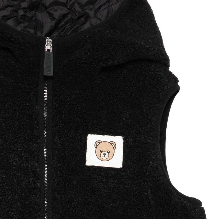 The Moschino unisex black teddy bear logo-print waistcoat is a stylish and playful piece, perfect for layering. Its versatile design and iconic teddy bear motif make it a fashionable choice for both boys and girls.