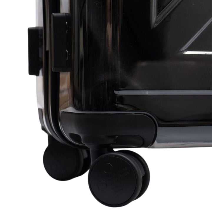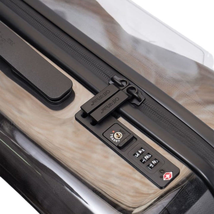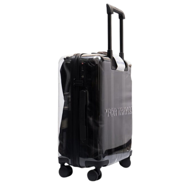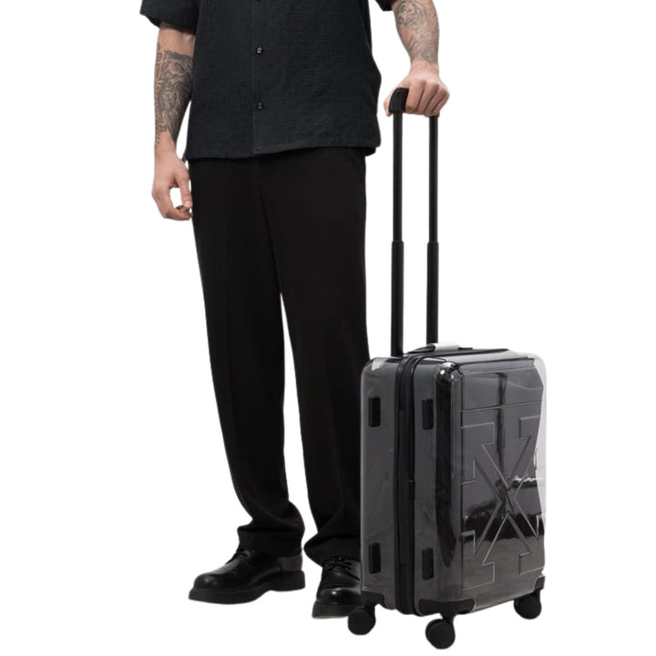 A luxury transparent carry-on suitcase by Off-White, featuring the signature X design on one side and the text FOR TRAVEL on the other. This modern hardcase cabin bag comes with smooth dual wheels for easy movement and a sturdy telescopic handle. Per