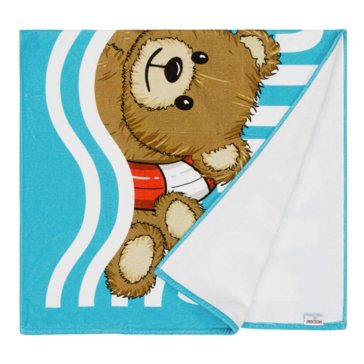 A bright blue beach towel for boys and girls by Moschino, featuring a bold white logo print and the designer's iconic Moschino Teddy Bear. Made in soft cotton, the printed side is velvety soft and smooth, and the plain side is soft, fluffy and absorbent.