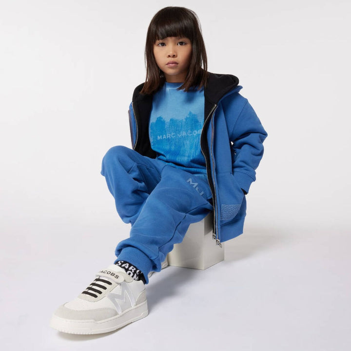 Blue joggers for boys and girls by MARC JACOBS, made in mid-weight cotton jersey for comfortable wear. These cuffed joggers have an easy drawstring waist and side seam pockets to keep essentials within reach. Rubberised initials can be seen on one leg and a jumbled logo patch adds detail to the back pocket.