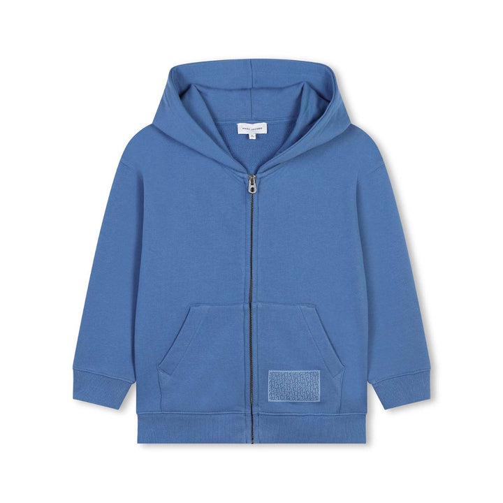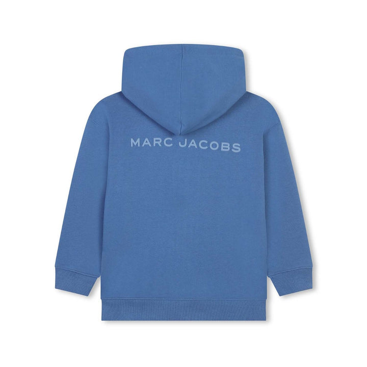 Blue zip-up hoodie for boys and girls by MARC JACOBS, made in mid-weight cotton jersey. This warm layer has ribbed knit trims and pouch pockets for functionality. The rubberised patch on the front features the American label's jumbled logo design and the raised lettering on the back makes an instant brand statement.