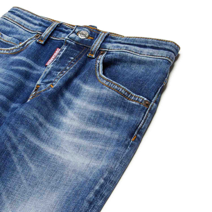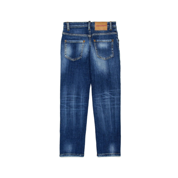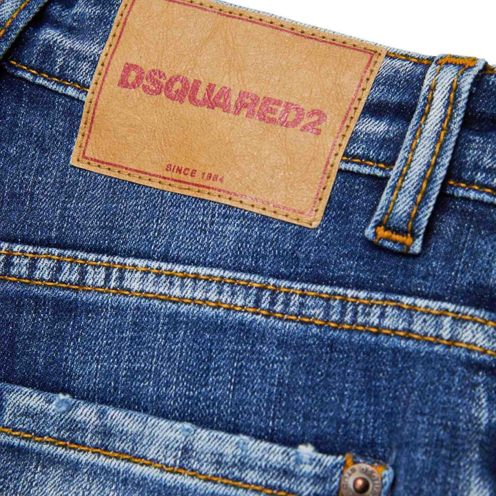 Stanislav five-pocket straight jeans. In mid-blue denim, featuring contrasting fading and whiskers. Contrasting stitching. Dsquared2 label on the fly (tab logo).