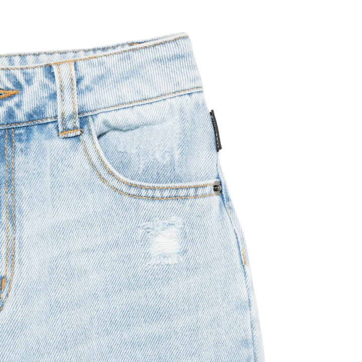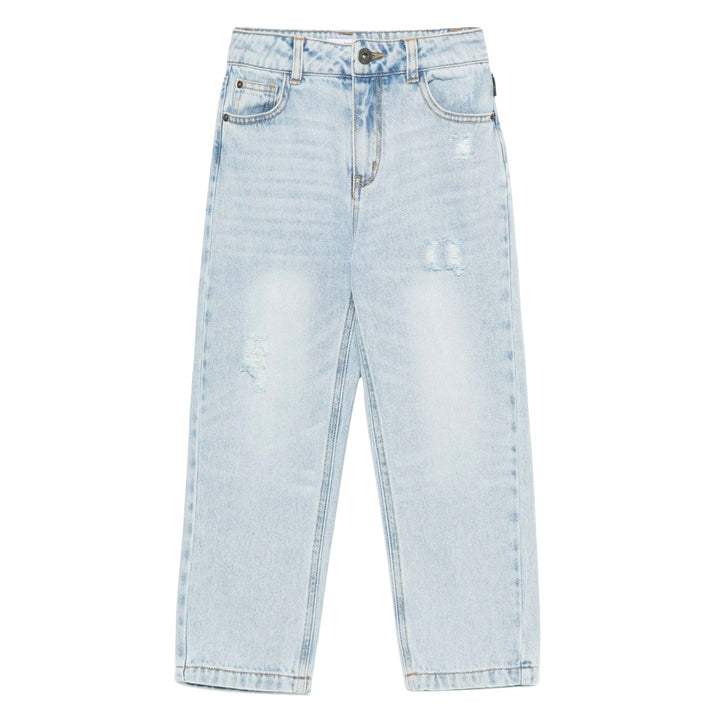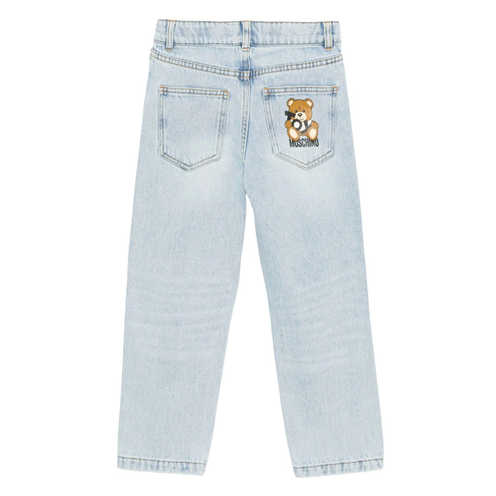 Light blue Teddy Bear distressed jeans with a concealed fly and button fastening, classic five-pocket design, belt loops, and a mini logo tag. Stylish and comfortable for everyday wear.