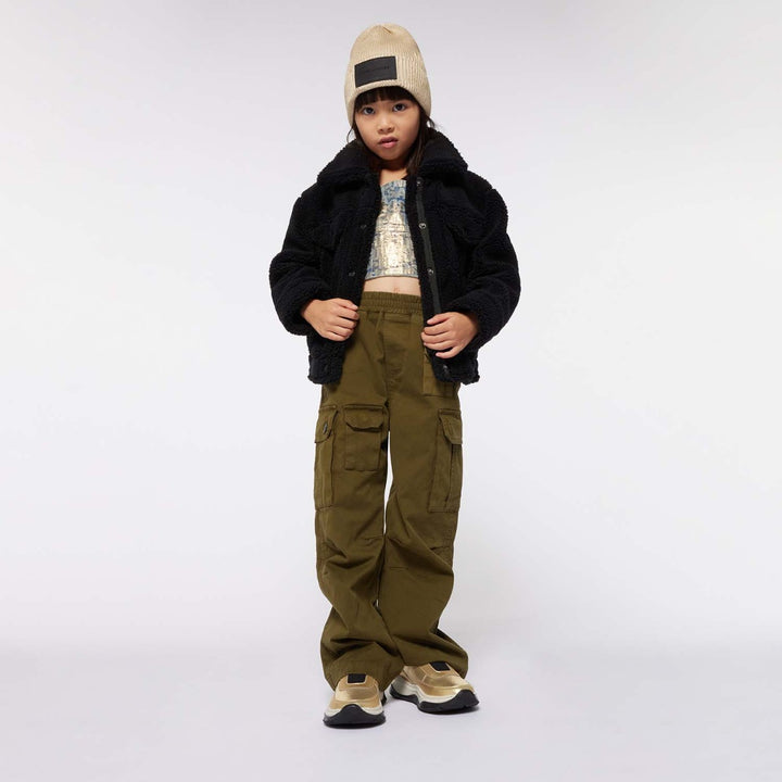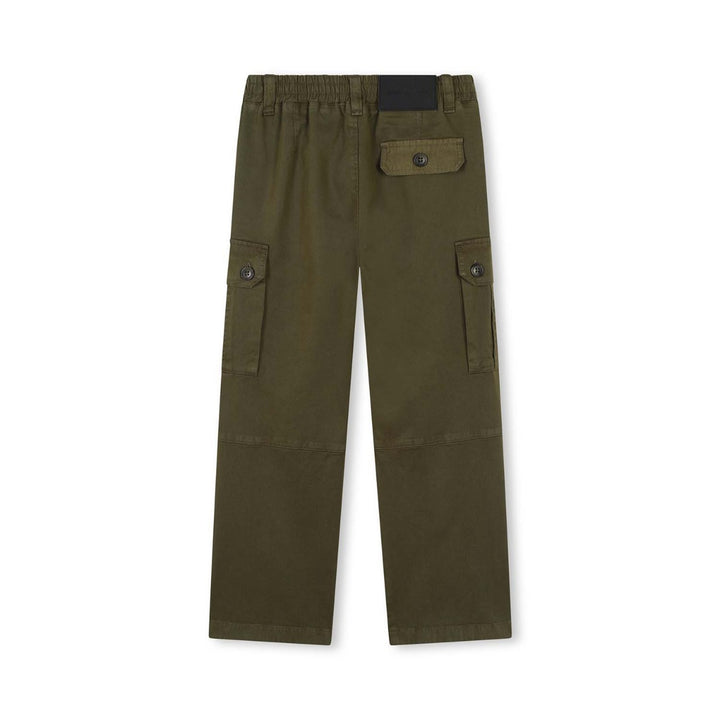 Casual moss green cargo trousers for boys and girls by MARC JACOBS. Inspired by the adult collection, these soft cotton twill trousers are created with multiple pockets, fastening with buttons and poppers. Comfortable to wear, they have an elasticated waistband for easy pull-on, with useful belt loops. The American brand's silicone label can be seen on the back for a designer touch.