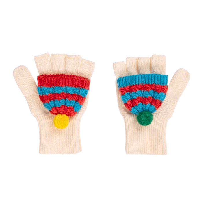 Ivory fingerless gloves for boys and girls by Stella McCartney Kids, knitted in organic cotton. These characterful snowman gloves have whimsical stitched faces and wear cable-knit 'hats', which can be folded over, creating mittens to keep their fingertips warm. The Stella McCartney fit can be quite small so choose a size up if you want room to grow.