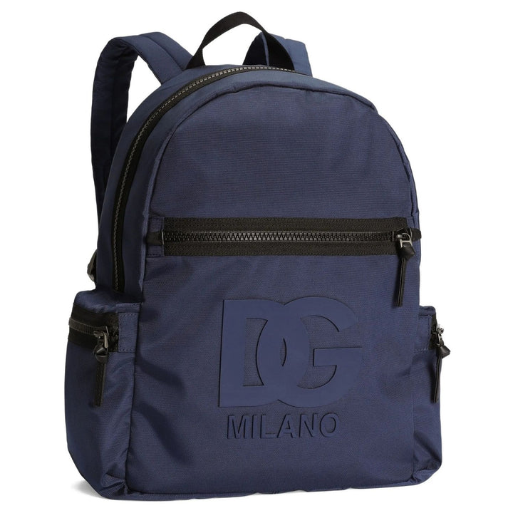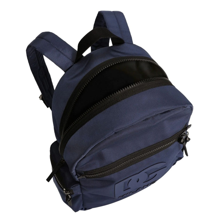 Combining function with iconic flair, this unisex navy blue backpack from Dolce & Gabbana Kids is a stylish essential for school or travel. Made in Italy, it features an embossed logo detail, multiple zip pockets for easy organization, and adjustable