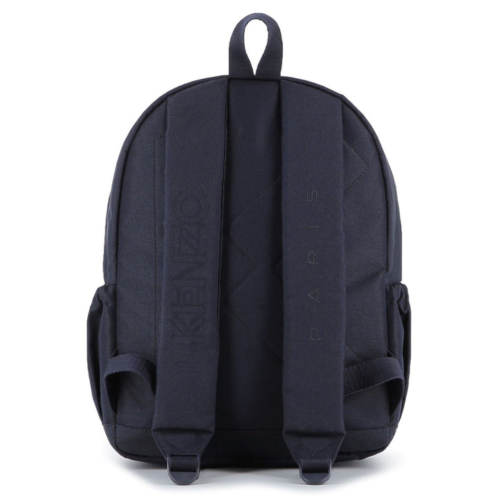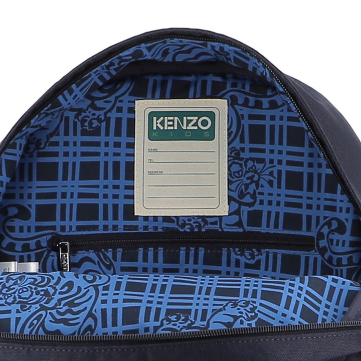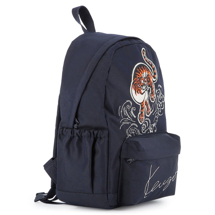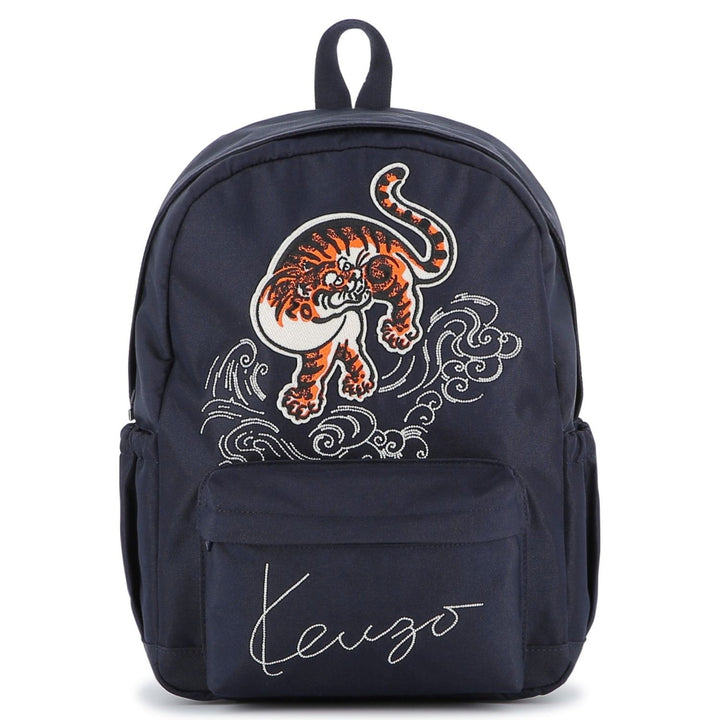 This stylish backpack from Kenzo Kids features a bold embroidered tiger patch leaping over swirling clouds, set against a deep blue background. The bag includes a spacious main compartment, a front zipped pocket with the signature "Kenzo" logo, sturd
