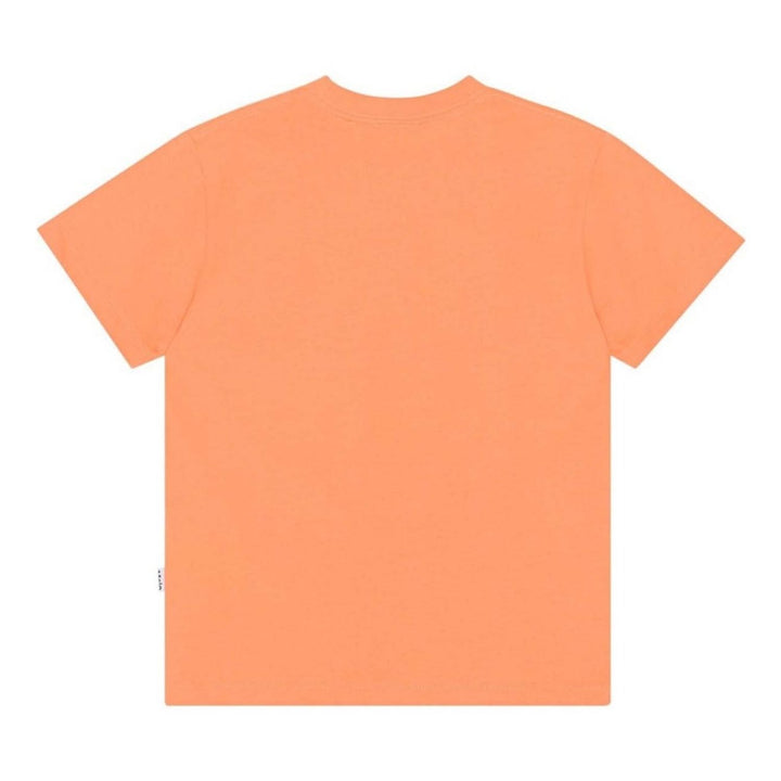 Orange graphic short-sleeved T-shirt for boys and girls, designed by Danish brand Molo. Made in soft organic cotton jersey, it has a cool black smiling face printed on the front for a fun look.