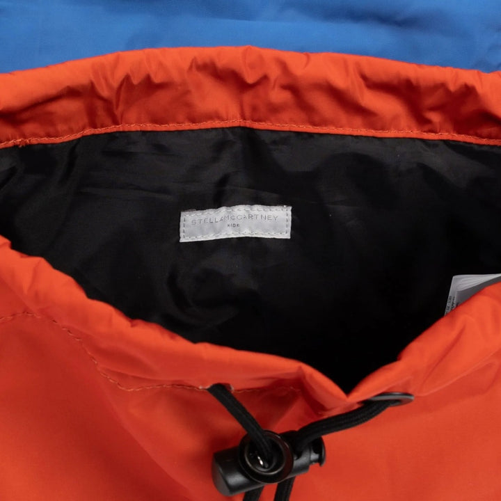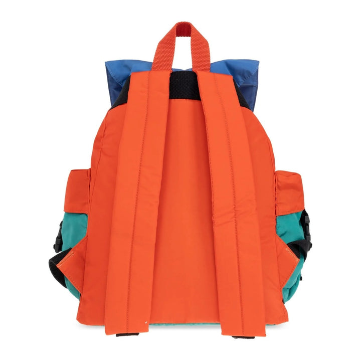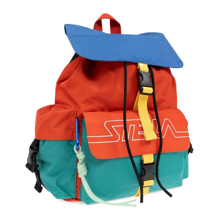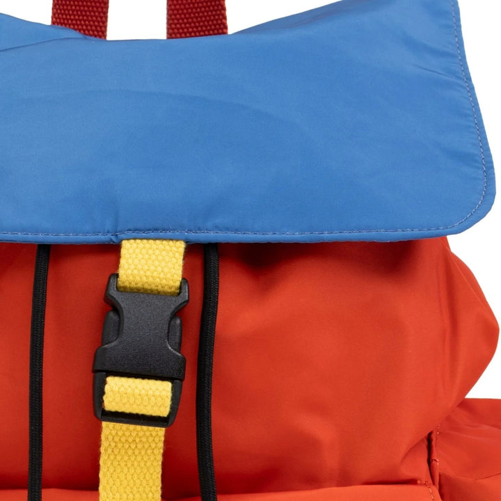 Red & multi color printed-logo backpack with a drawstring and clasp fastening, adjustable shoulder straps, and two side patch pockets. Stylish and practical for daily use.