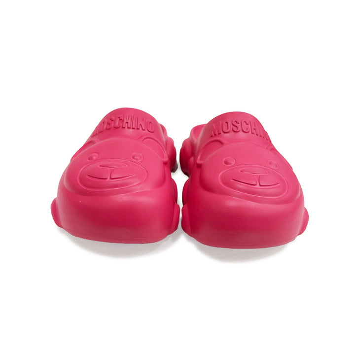 Red chunky clogs for boys and girls by Moschino Kid-Teen, made in lightweight foam rubber. Versatile to wear indoors and outdoors, these fun and comfortable slip-on sandals are moulded in the Moschino Teddy Bear shape with embossed logos for an unmis