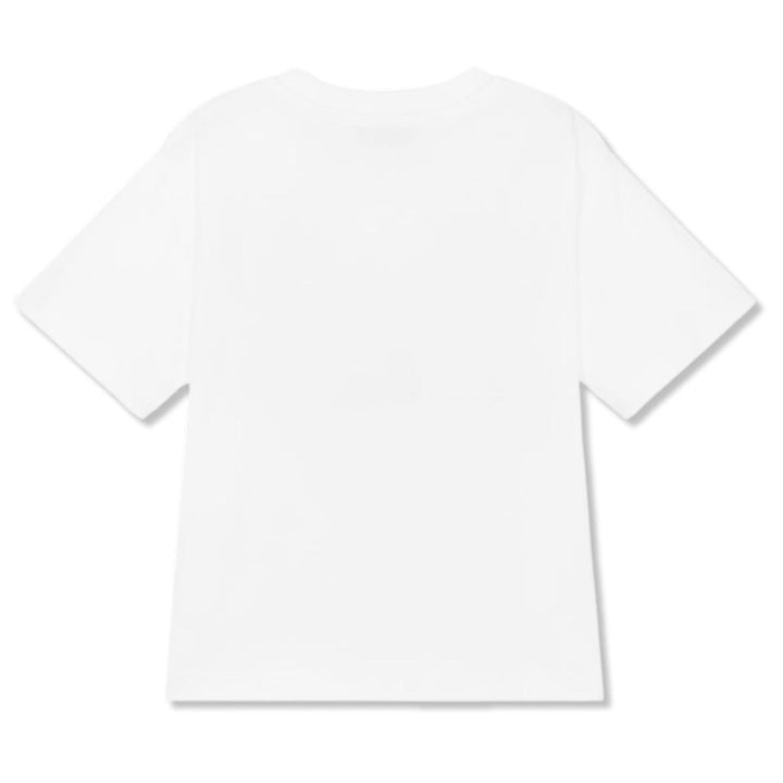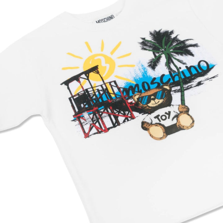 White cotton T-shirt for boys and girls by Moschino, made in comfortable jersey. This oversized tee has a ribbed crew neck for casual comfort. It has a beach illustration printed on the front, featuring the iconic Moschino Teddy Bear.