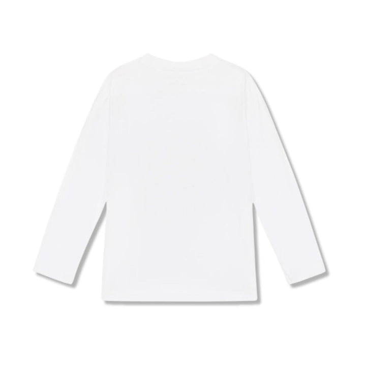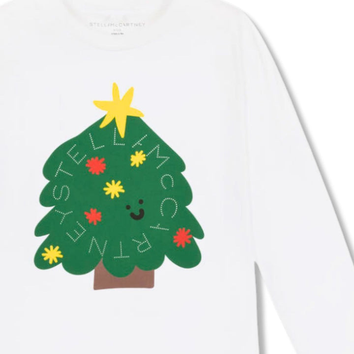 White long-sleeved top for boys and girls by Stella McCartney Kids, made in soft and stretchy organic cotton jersey. Casual and comfortable, it has a fun Christmas tree printed on the front with a bright yellow star on the top. The Stella McCartney f