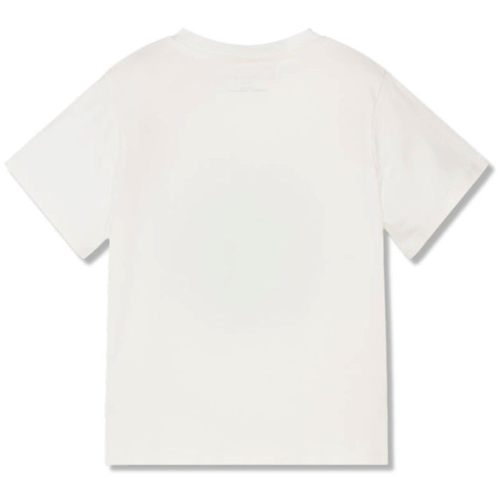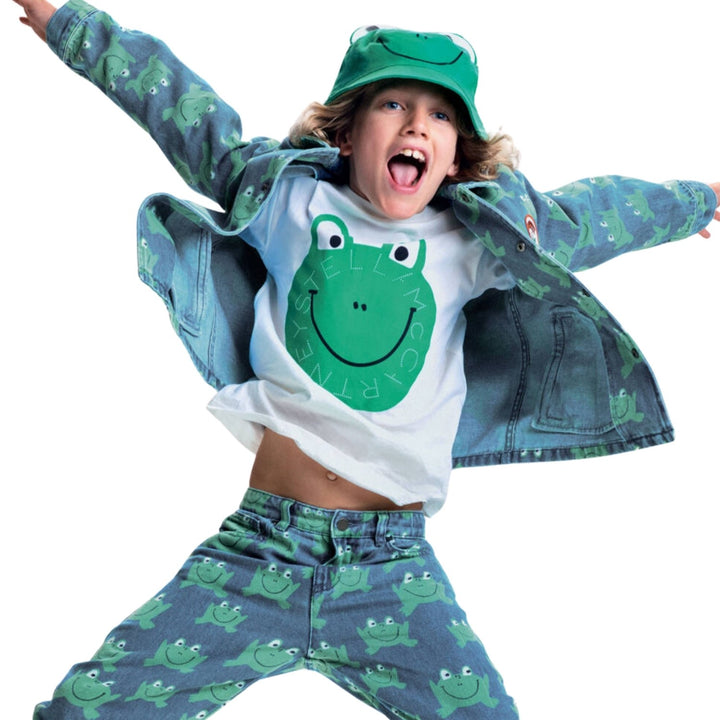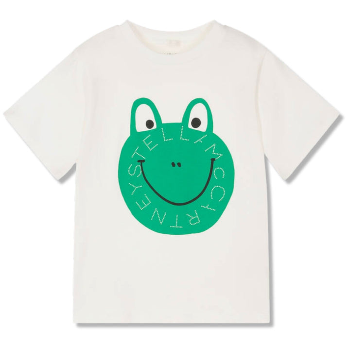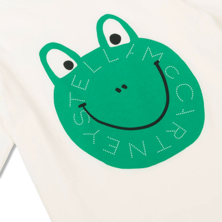 Off-white T-shirt for boys and girls by Stella McCartney Kids, made in soft organic cotton jersey. Cool and comfortable, this causal tee has a fun green frog on the front with a circular white logo.