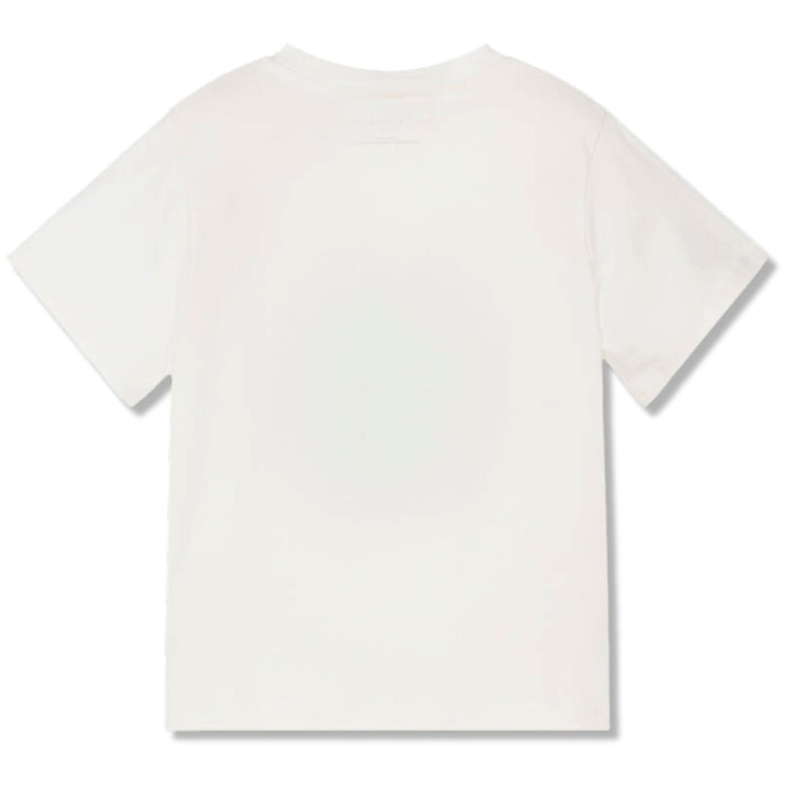 Off-white T-shirt for boys and girls by Stella McCartney Kids, made in soft organic cotton jersey. Cool and comfortable, this causal tee has a fun green frog on the front with a circular white logo.