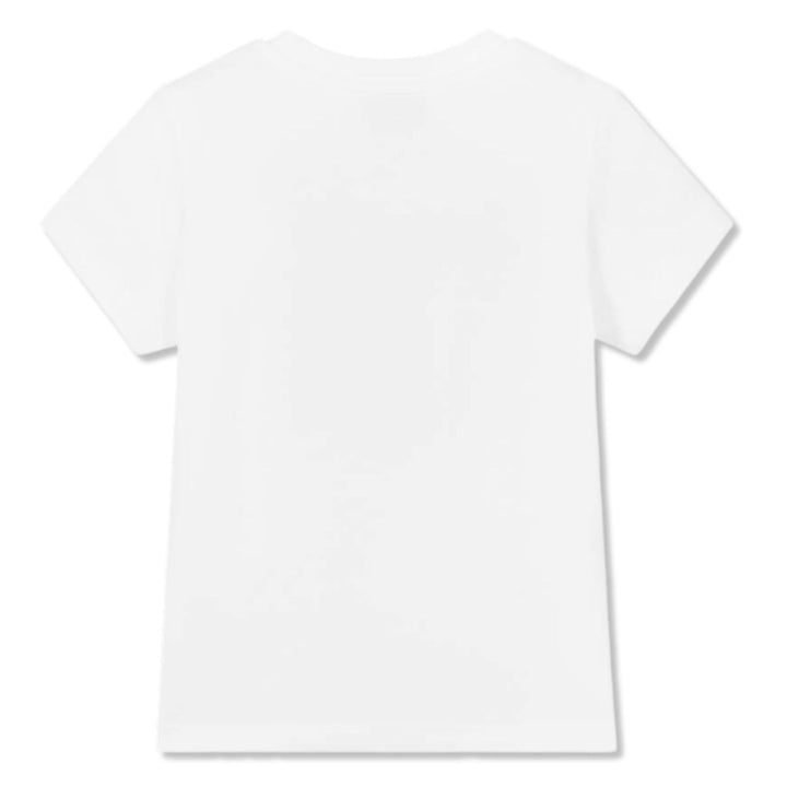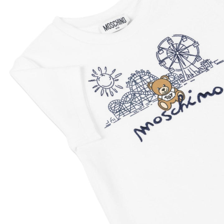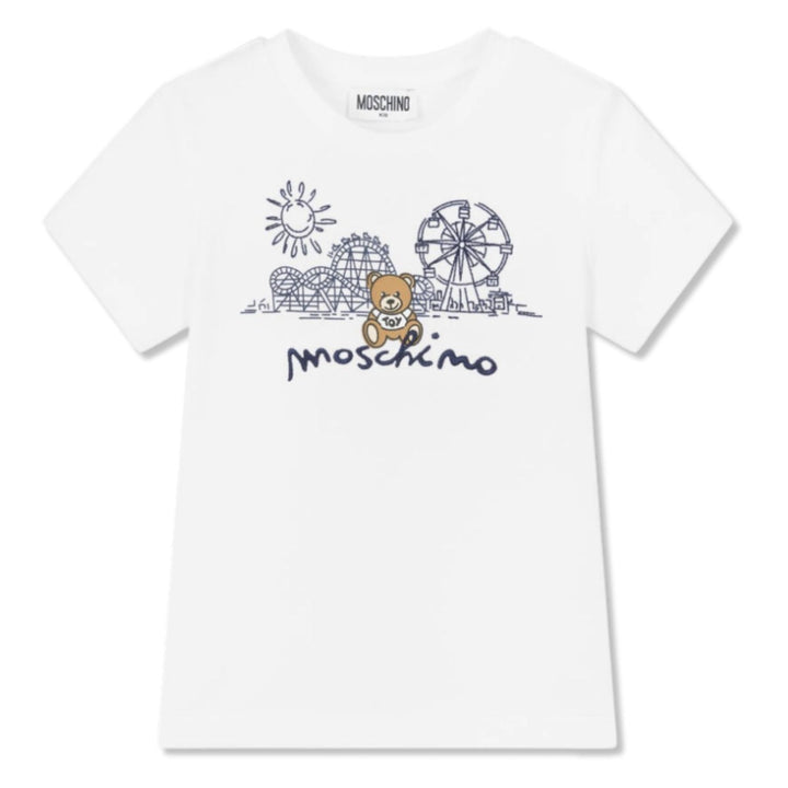 White T-shirt for boys and girls by Moschino, made in cool and comfortable cotton pique. This casual top has a navy blue funfair illustration neatly embroidered and printed on the front. It features the iconic Moschino Teddy Bear and navy blue logo embroidery for instant designer appeal.