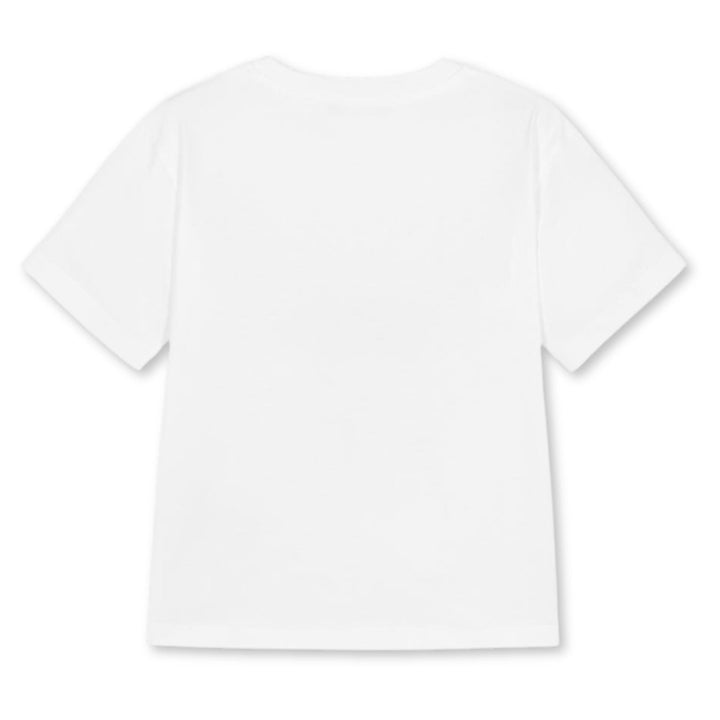 A white, short-sleeved T-shirt for boys and girls by luxury brand Balmain, made in soft cotton jersey. Simply styled, this instantly recognisable piece has a neon yellow logo design on the front. It has a ribbed crew neck and dropped shoulder seams f
