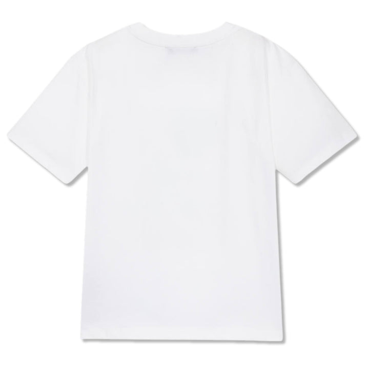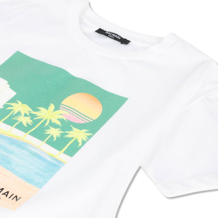 White Mini-me T-shirt for boys and girls by luxury designer, Balmain. A pastel-inspired sunset motif is printed on the chest for a seasonal feel, with the label iconic code beneath for a branded stamp.