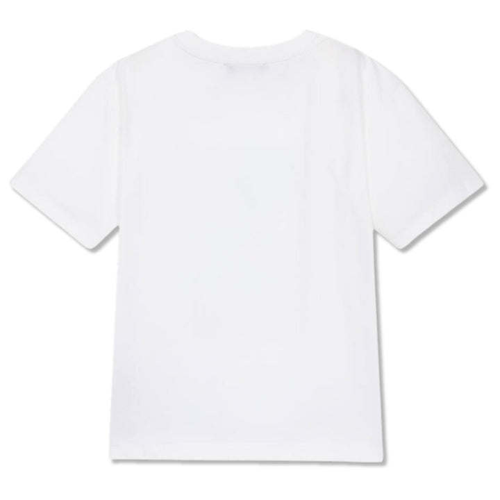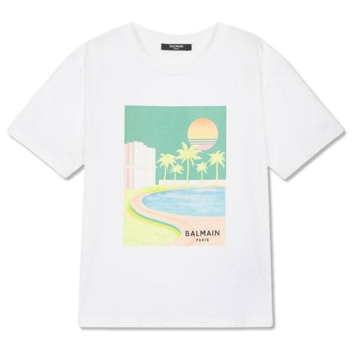 White Mini-me T-shirt for boys and girls by luxury designer, Balmain. A pastel-inspired sunset motif is printed on the chest for a seasonal feel, with the label iconic code beneath for a branded stamp.
