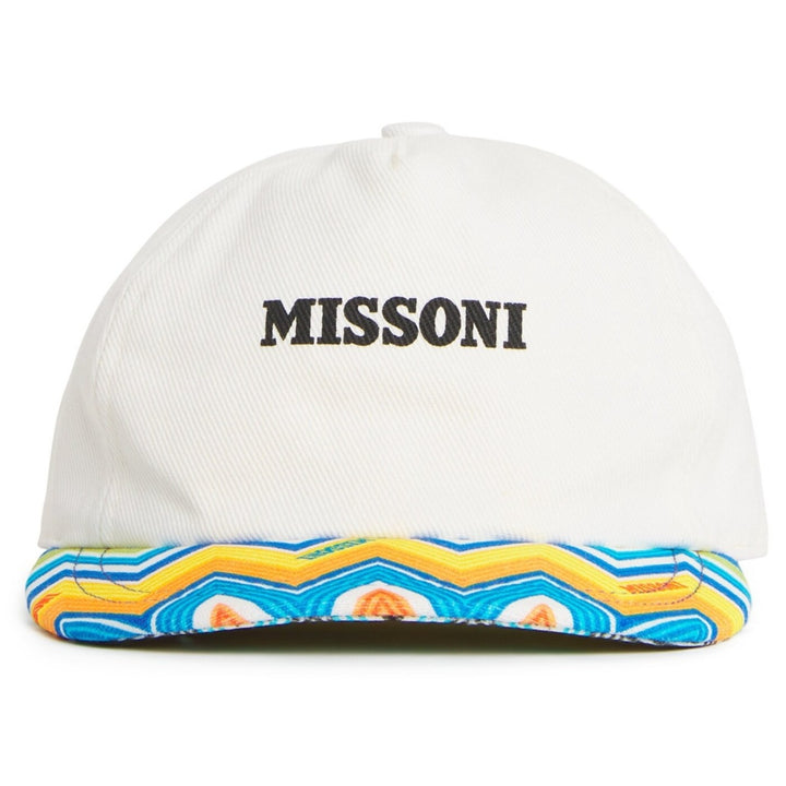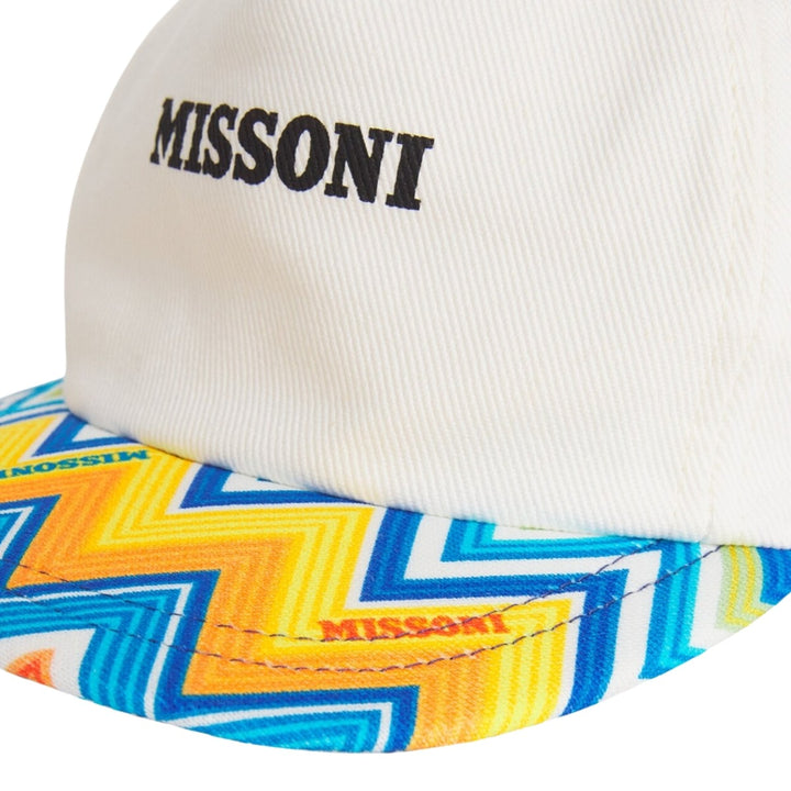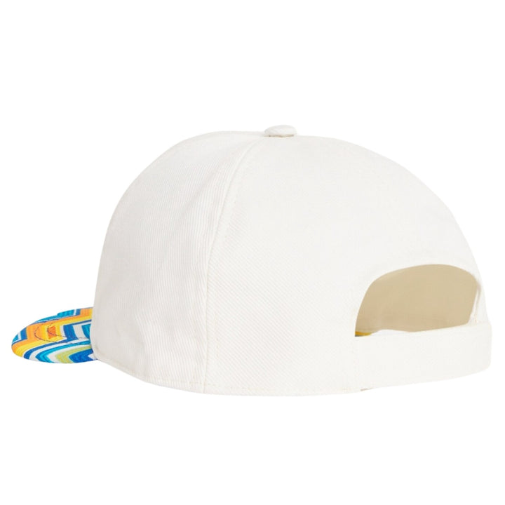 White branded baseball cap for boy and girl by Italian label Missoni, made in soft cotton twill. A stylish accessory to her resort wear look, it features the designer's iconic zigzag pattern on the stiff peak, in shades of blue with yellow and orange. An adjustable velcro strap on the back ensures a comfortable fit.