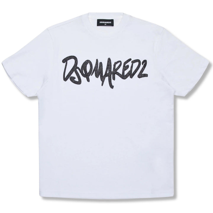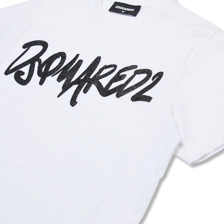 Short-sleeved crew-neck T-shirt in jersey. Dsquared2 logo with applied rhinestones on the front. Made of 1% cotton. Perfect for evening parties and special occasions.