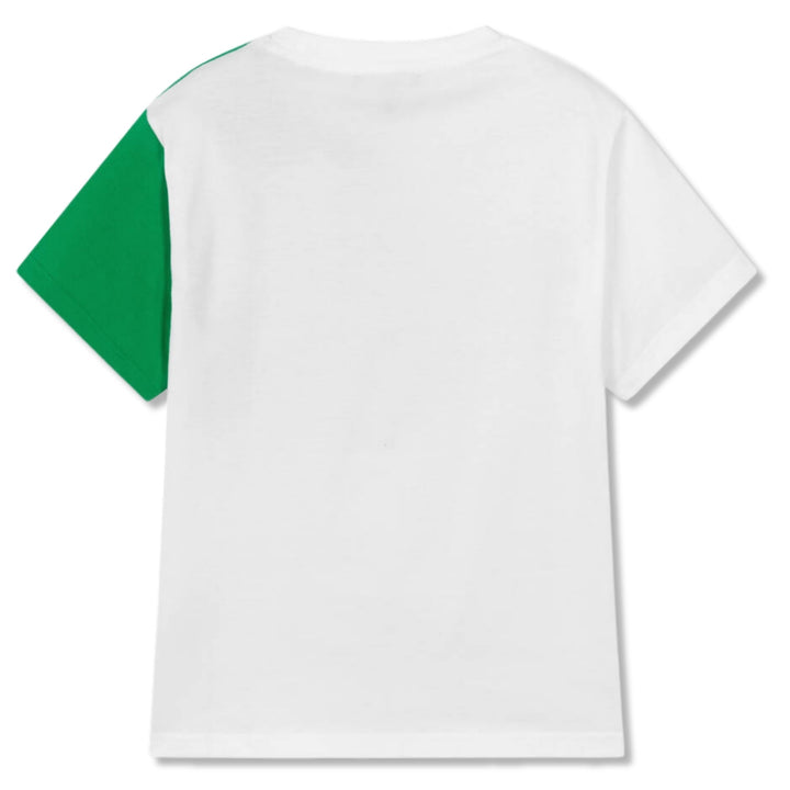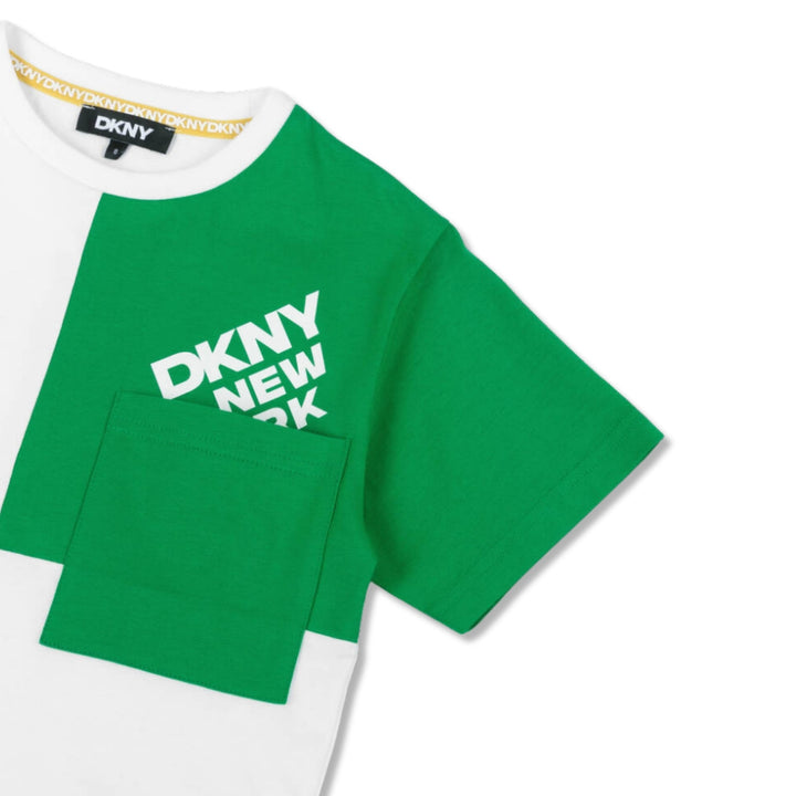 White organic cotton T-shirt for boys and girls by DKNY, with a green colourblock design. In a comfortable relaxed fit, this soft jersey top is casually styled with a crew neckline and chest patch pocket. A contrasting logo print adds instant designe