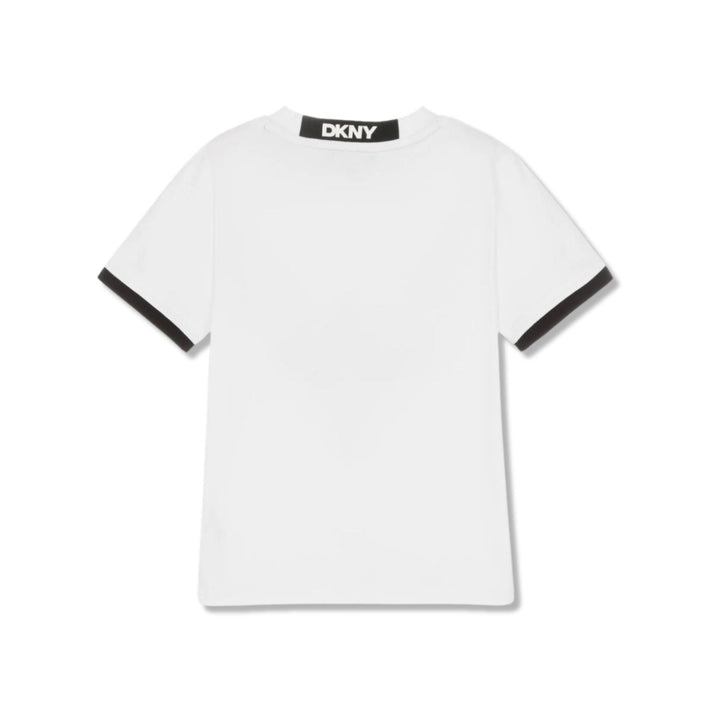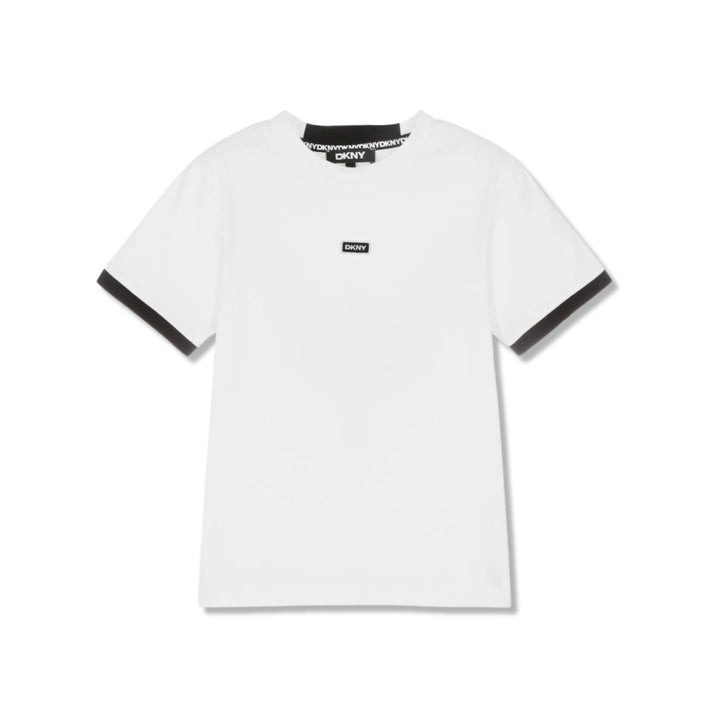 White T-shirt for boys and girls by DKNY, made in soft and stretchy organic cotton jersey. Cool and comfortable, the short sleeves have black ribbed cuffs and there is a black and white embroidered applique logo patch on the front. For added designer appeal, it has a black and a white logo printed on the back of the neck.