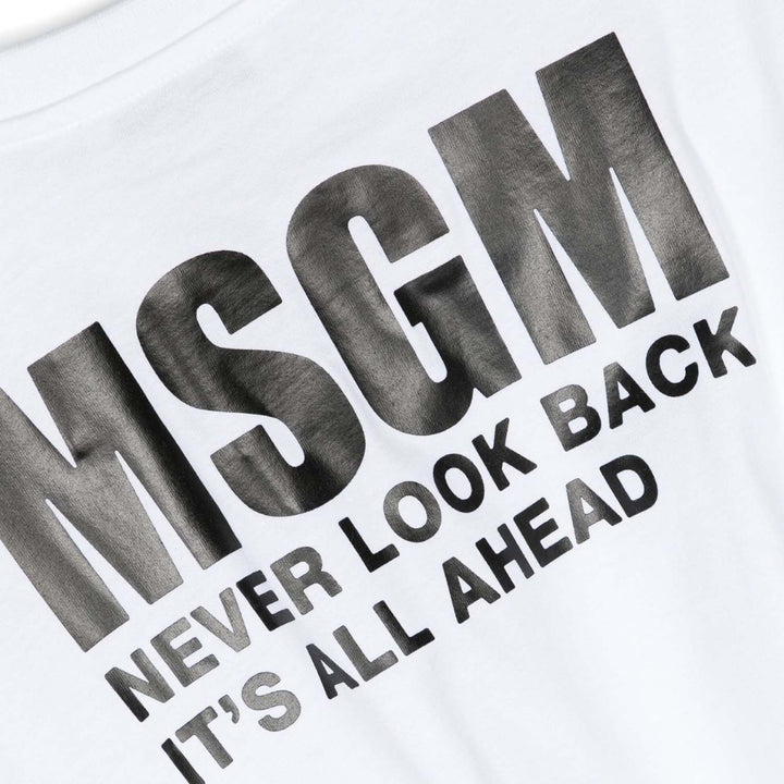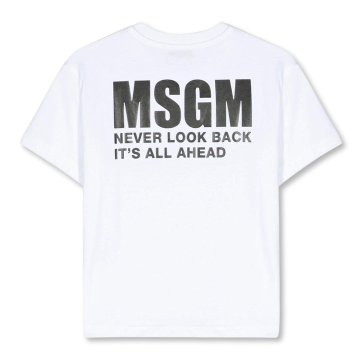 Unisex white cotton T-shirt with logo print to the back and short sleeves.