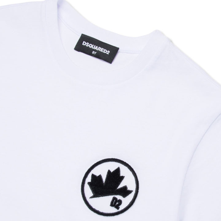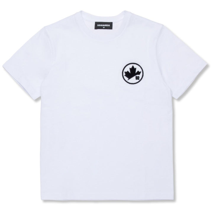 A fresh white T-shirt with a striking maple-leaf logo print, adding a modern twist to everyday wear.