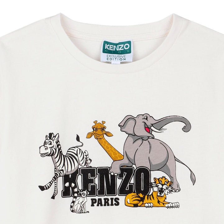 This playful white t-shirt from Kenzo Kids features a colorful print of safari animals zebra, giraffe, elephant, and tiger—surrounding the bold "Kenzo Paris" logo on the chest. Made from soft, comfortable cotton with a classic crew neckline and rel