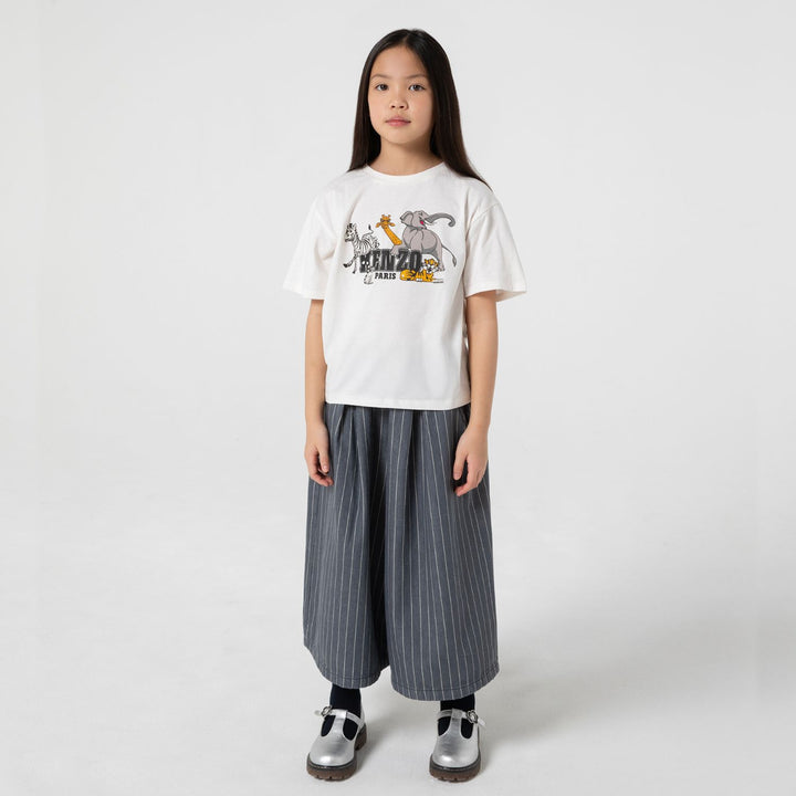 This playful white t-shirt from Kenzo Kids features a colorful print of safari animals zebra, giraffe, elephant, and tiger—surrounding the bold "Kenzo Paris" logo on the chest. Made from soft, comfortable cotton with a classic crew neckline and relaxed fit, it’s perfect for adding a fun and adventurous spirit to any casual look.