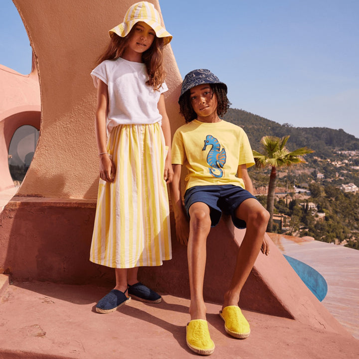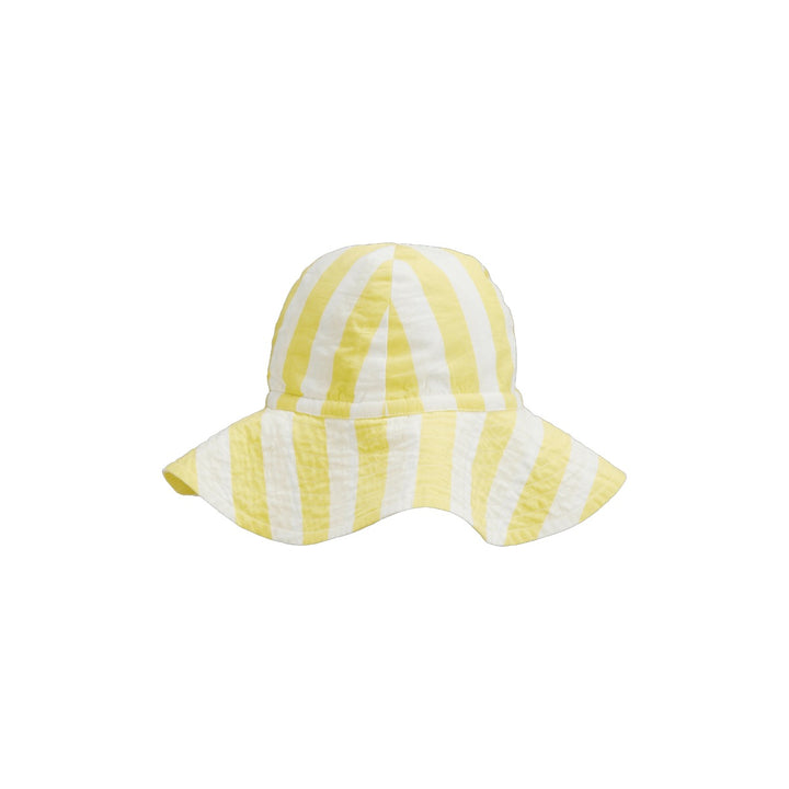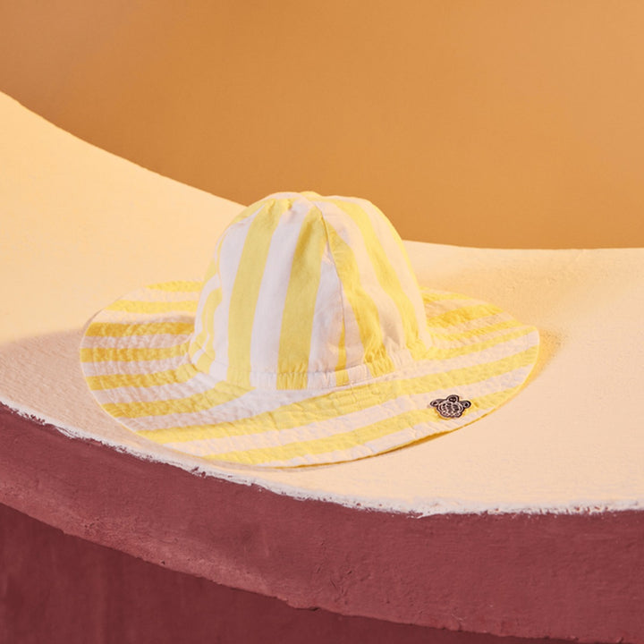 Girls have the grace of grand ladies with this cotton hat for girls. The wide, undulating brim and tangy stripes are embellished with a tiny turtle swimming between the stitching.