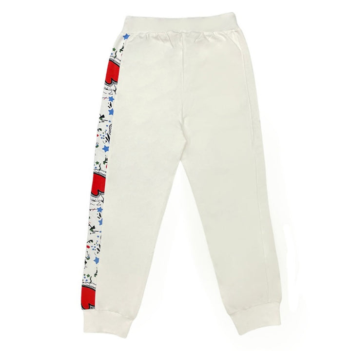 White abstract jogger pants by sku Amp up your wardrobe with this pair of abstract jogger. These joggers have a relaxed fit that ensures easy wearability. These joggers offer elasticated cuffs and waist. Also, the woven tape adds detail to the sides