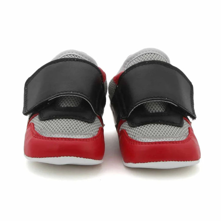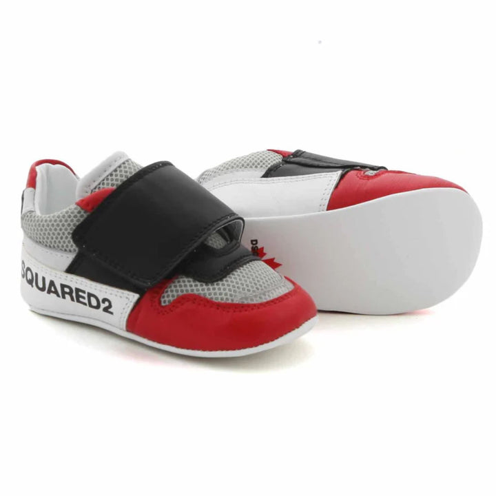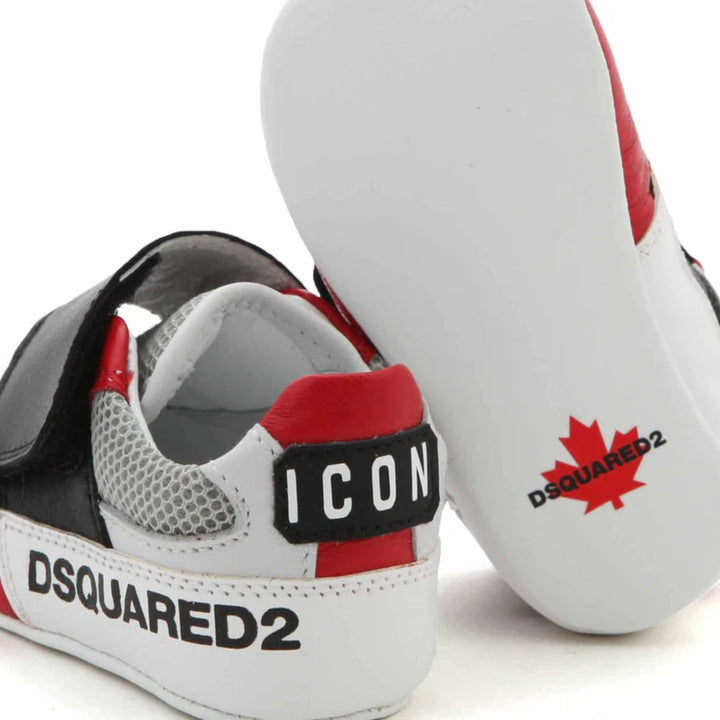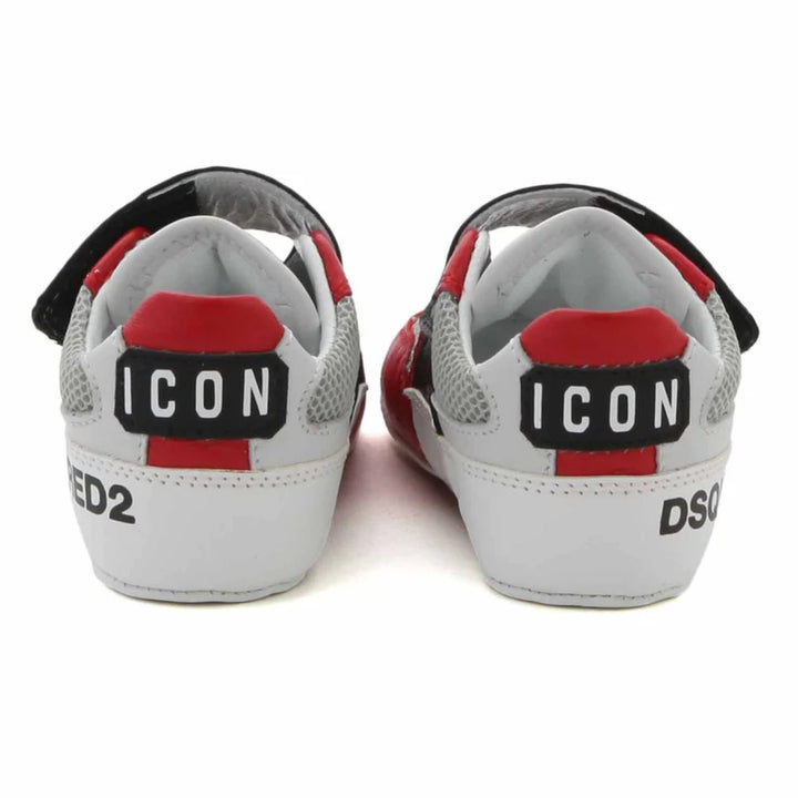 Sporty baby sneakers featuring a red and white colour‑block design with breathable grey mesh panels and wide black velcro straps for easy on and off. The sides are detailed with bold Dsquared2 and ICON branding, while the soft, flexible sole keeps little feet comfortable for everyday wear.
